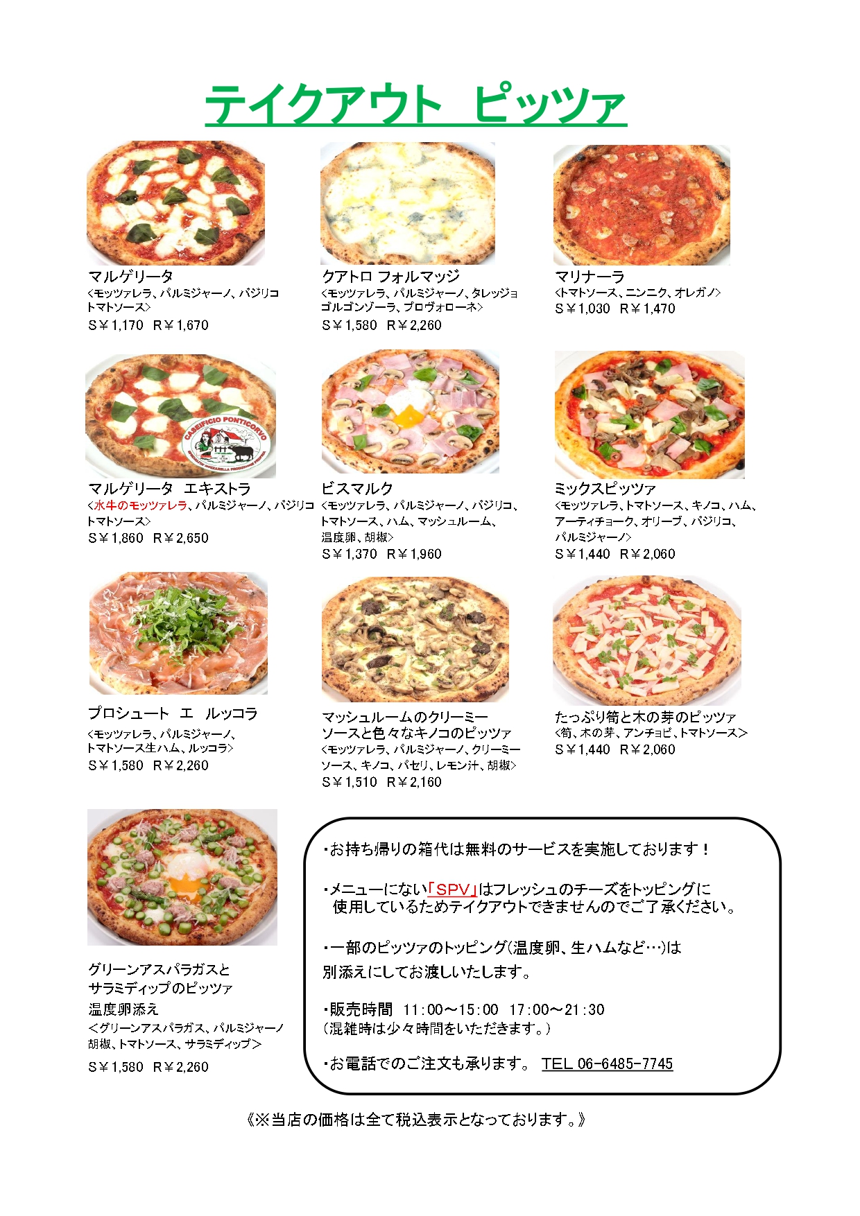 テイクアウトピッツァメニュー