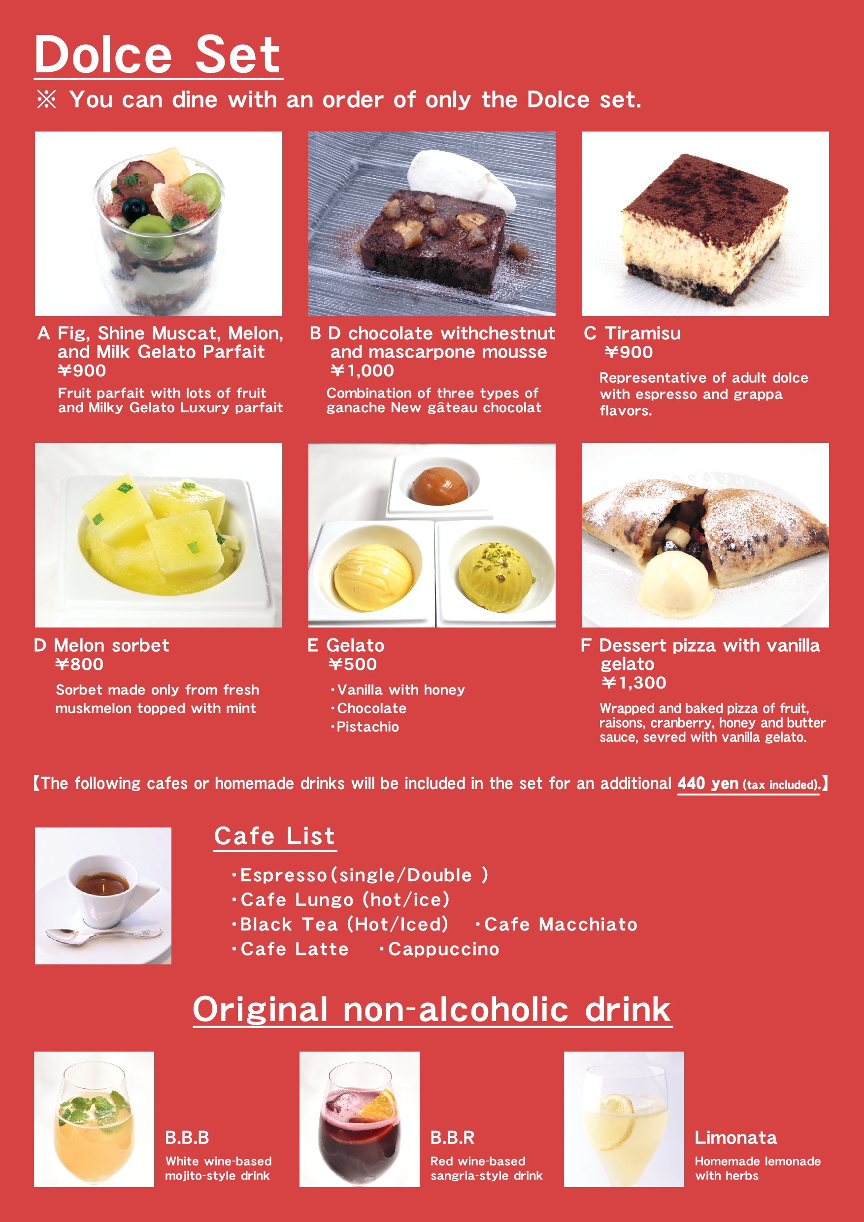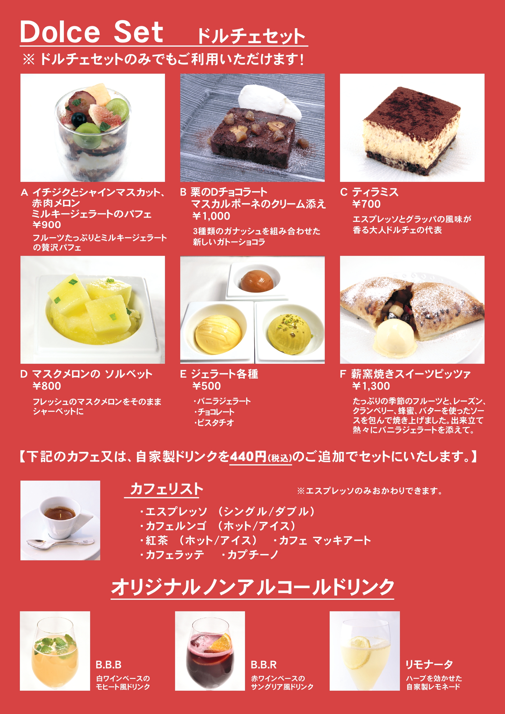 お食事以外でも気軽にご利用いただけるようにDolce Set をご用意しております!