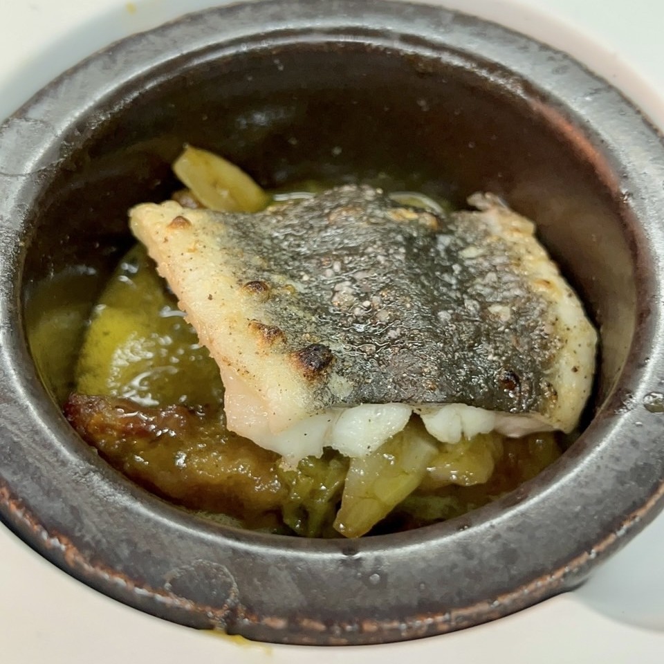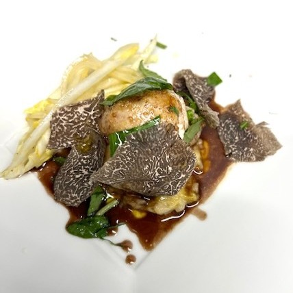 ・じっくりバターで火入れしたトラフグと焼き白子 黒トリュフ添え