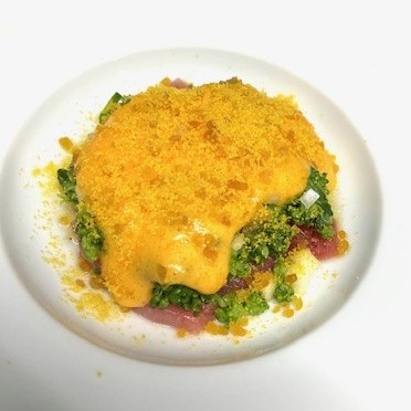・スモークオイルをかけた本マグロ りんご風味のザバイオーネ ボッタルガと菜の花を覆って