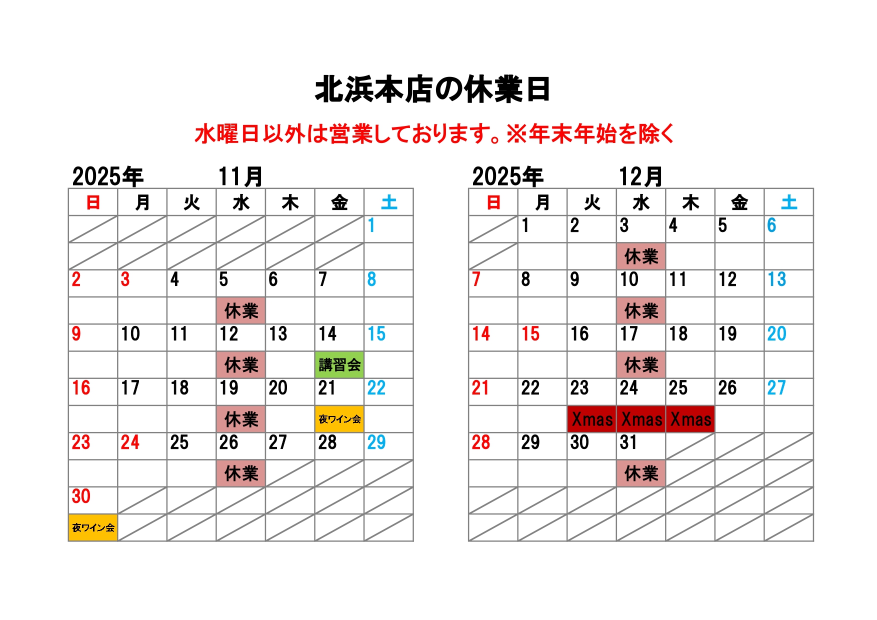 2025年11月・12月休業日のお知らせ ≪4月より休業日は水曜日のみになりました!≫